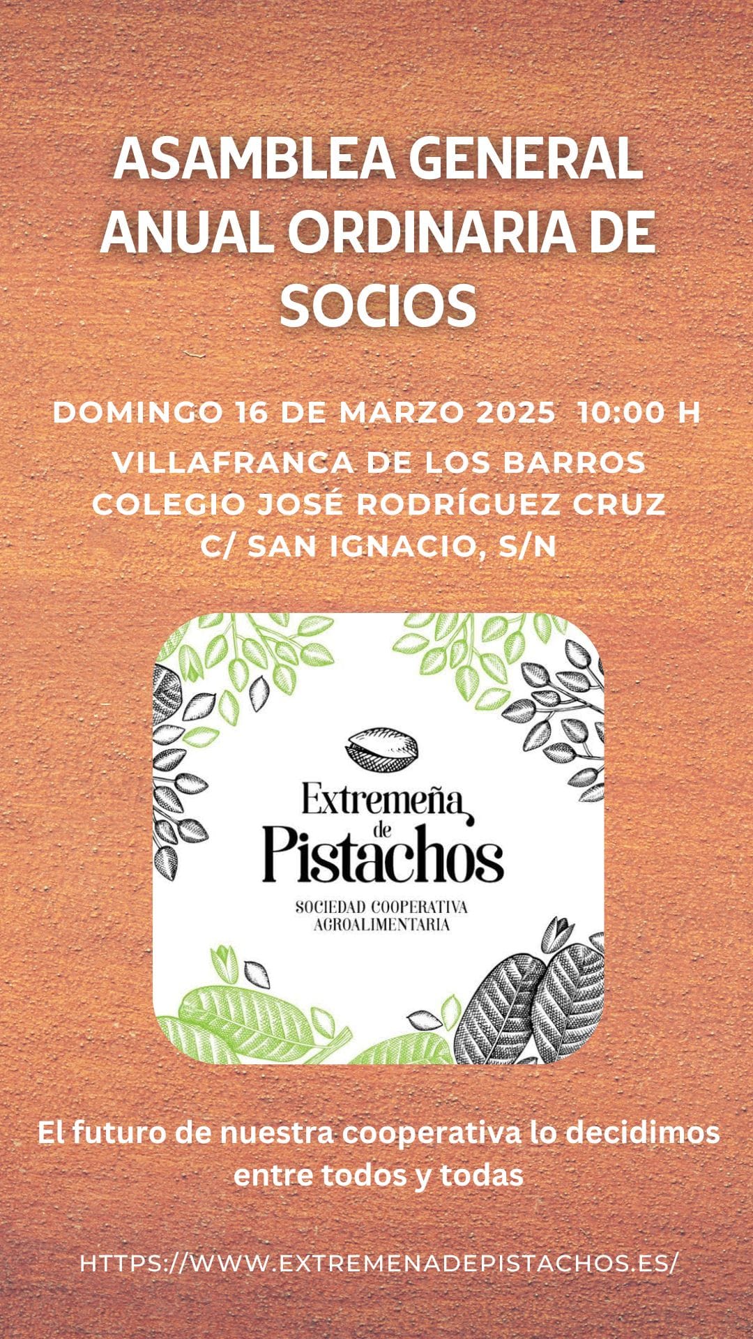 Como todos los años, el Consejo Rector de nuestra cooperativa rendirá cuentas ante los socios, hará balance de gestión del ejercicio 2024 y presentará las líneas maestras que marcarán el futuro de nuestra Sociedad en su próxima Asamblea General Ordinaria. Todos los socios y socias estamos convocados el próximo día 16 de marzo a las 10:00 h en el Colegio Público José Rodríguez Cruz de Villafranca de los Barros (Badajoz). Dada la importancia de los asuntos a tratar, se ruega la asistencia de todos los socios. El futuro de nuestra cooperativa lo decidimos entre todos. Nuestra cooperativa será lo que entre todos queramos que sea. Apunta la cita en tu agenda, nos vemos en la Asamblea. El pistacho nos une. Be coop!